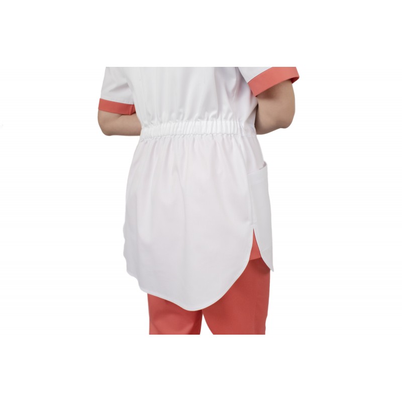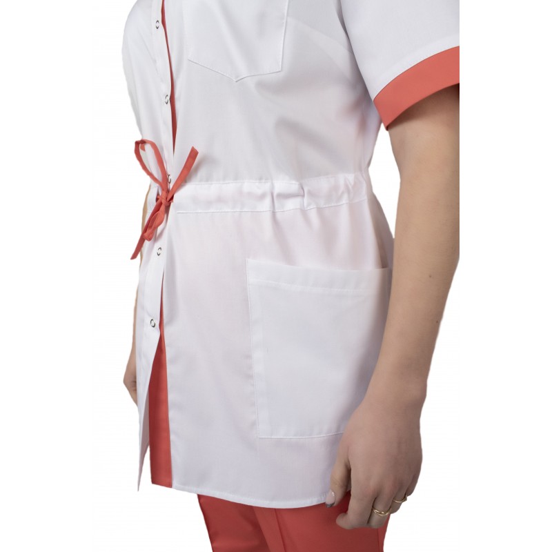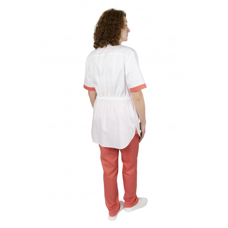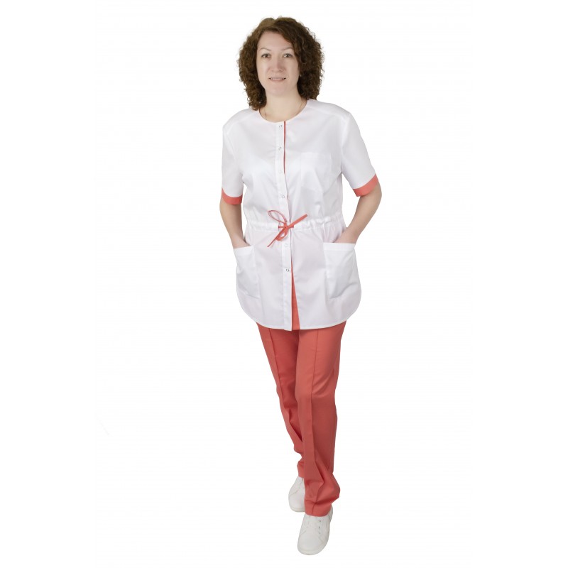 Покрой: Костюм женский для медицинского персонала состоит из куртки и брюк. Куртка прямого силуэта с фигурным низом. Перед с кокеткой, нагрудными вытачками и нагрудным карманом на правой части переда. На уровне талии обработана настрочная кулиса и шнур из отделочной ткани. Перед с боковыми накладными карманами, одна сторона которых входят в боковой шов. Рукава короткие, брюки прямые, пояс на резинке со шнуром.