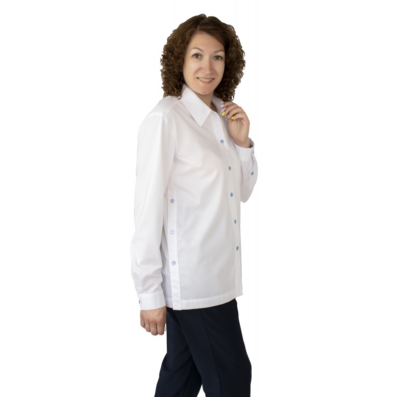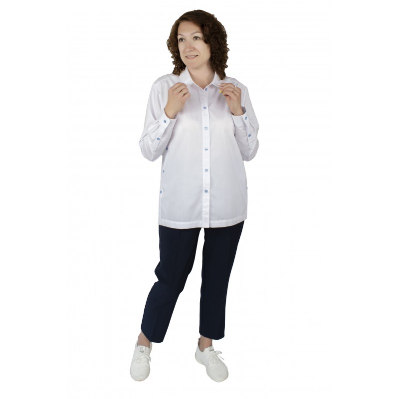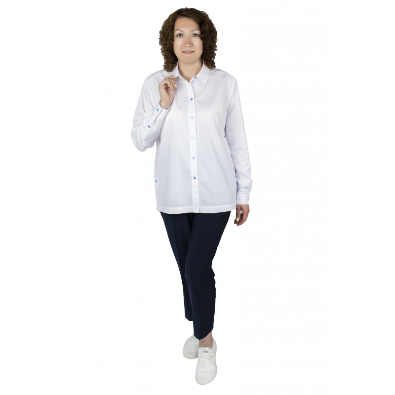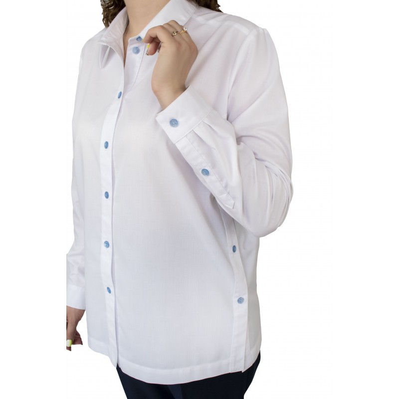 Покрой: Блузка женская прямого силуэта, втачного покроя. По переду притачная планка, застегивающая на 6 петель и 6 пуговиц. По переду нагрудная вытачка из проймы. Боковой шов обработан притачными планками, застегивающиеся на 4 петли и 4 пуговицы. Спинка со средним швом. Рукава втачные одношовные на манжете с двумя односторонними складками и шлицей. Манжета застегивается на 1 пуговицу, шлица застегивается на 1 пуговицу. Воротник стояче-отложной с отрезной стойкой.