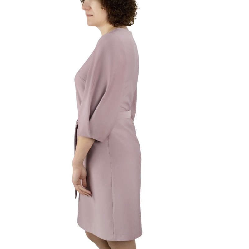 Покрой: Платье женское, прямого силуэта, втачного покроя. Пояс съемный. Перед с нагрудными вытачками из бокового шва. Спинка с застежкой на потайную тесьму-молнию с среднем шве. Рукава одношовные с центральной пышной складкой и двумя встречными складками.